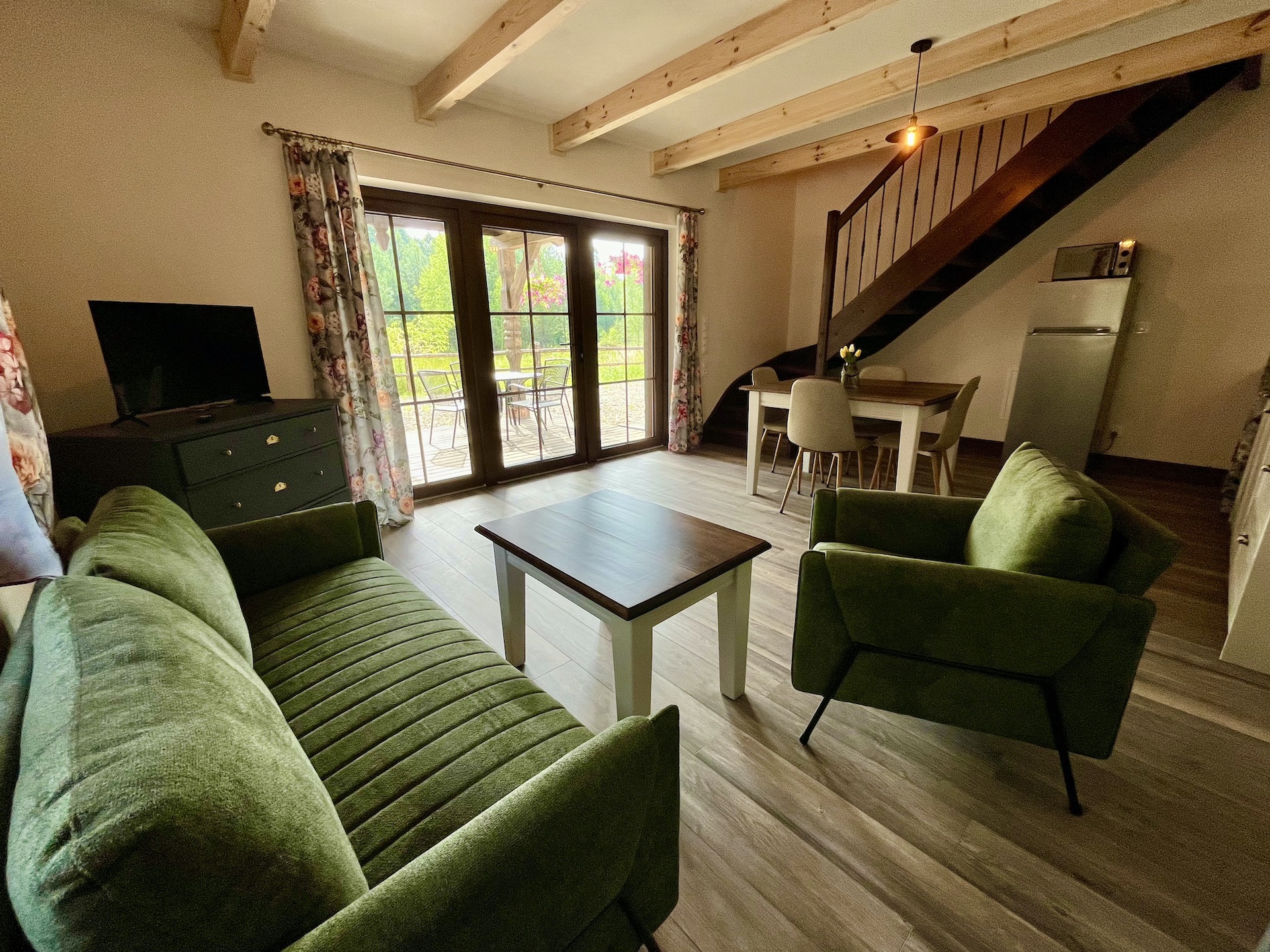 Apartament o ekspozycji południowo-wschodniej posiada niezależne wejście oraz taras, na którym znajduje się stół z krzesłami oraz dwa fotele ze stolikiem.