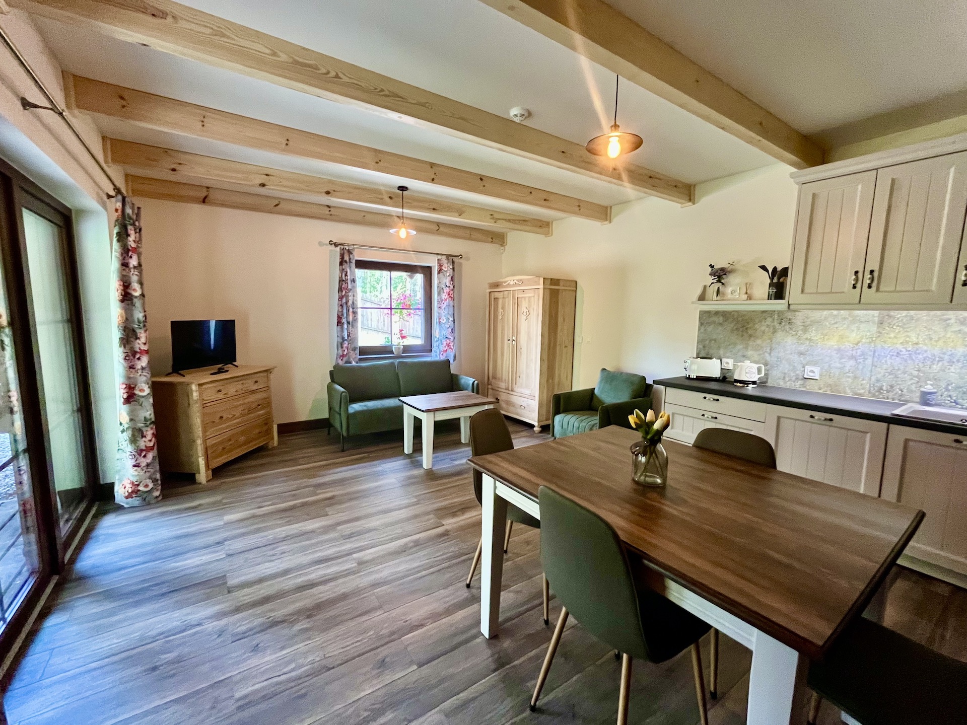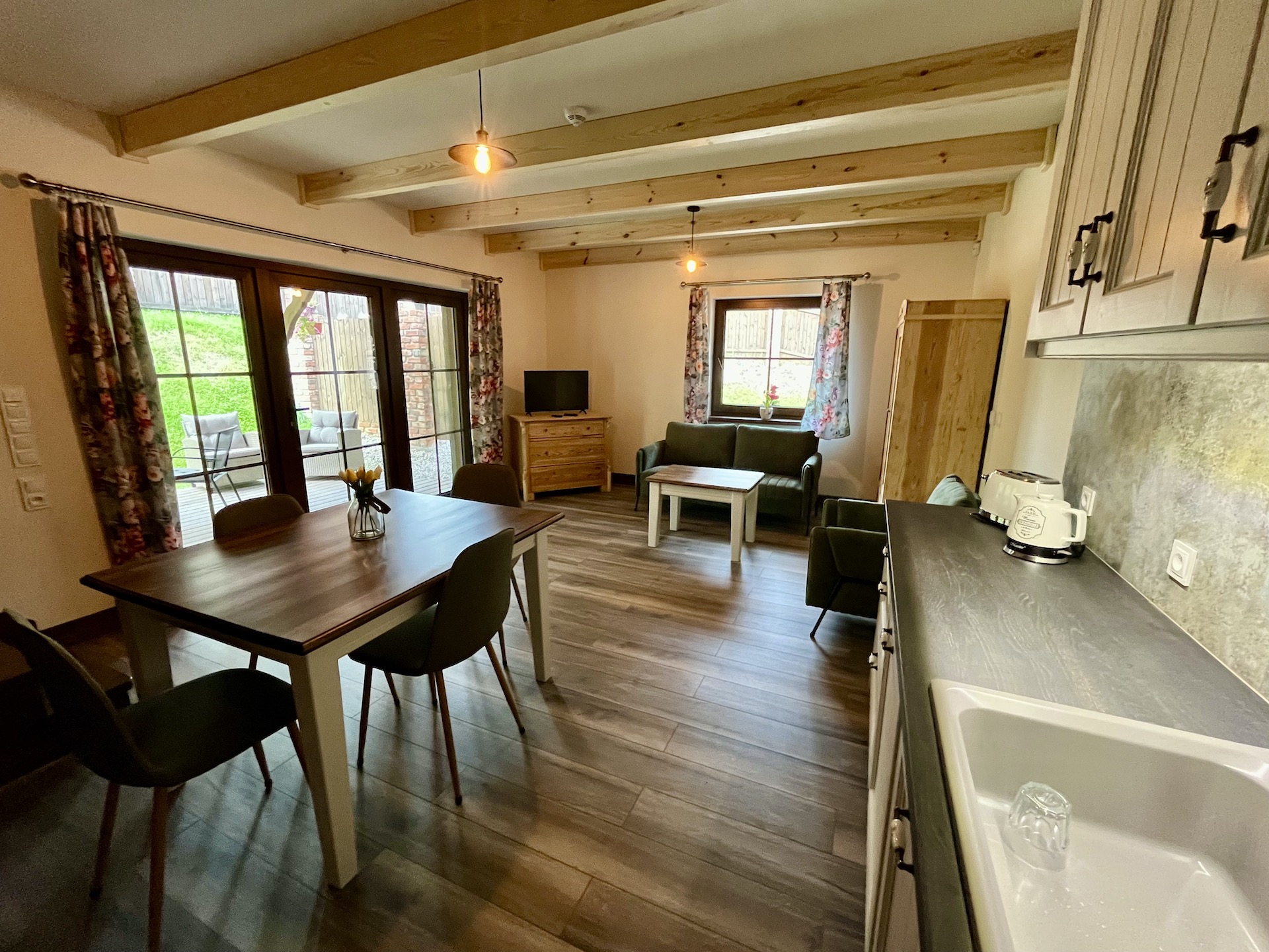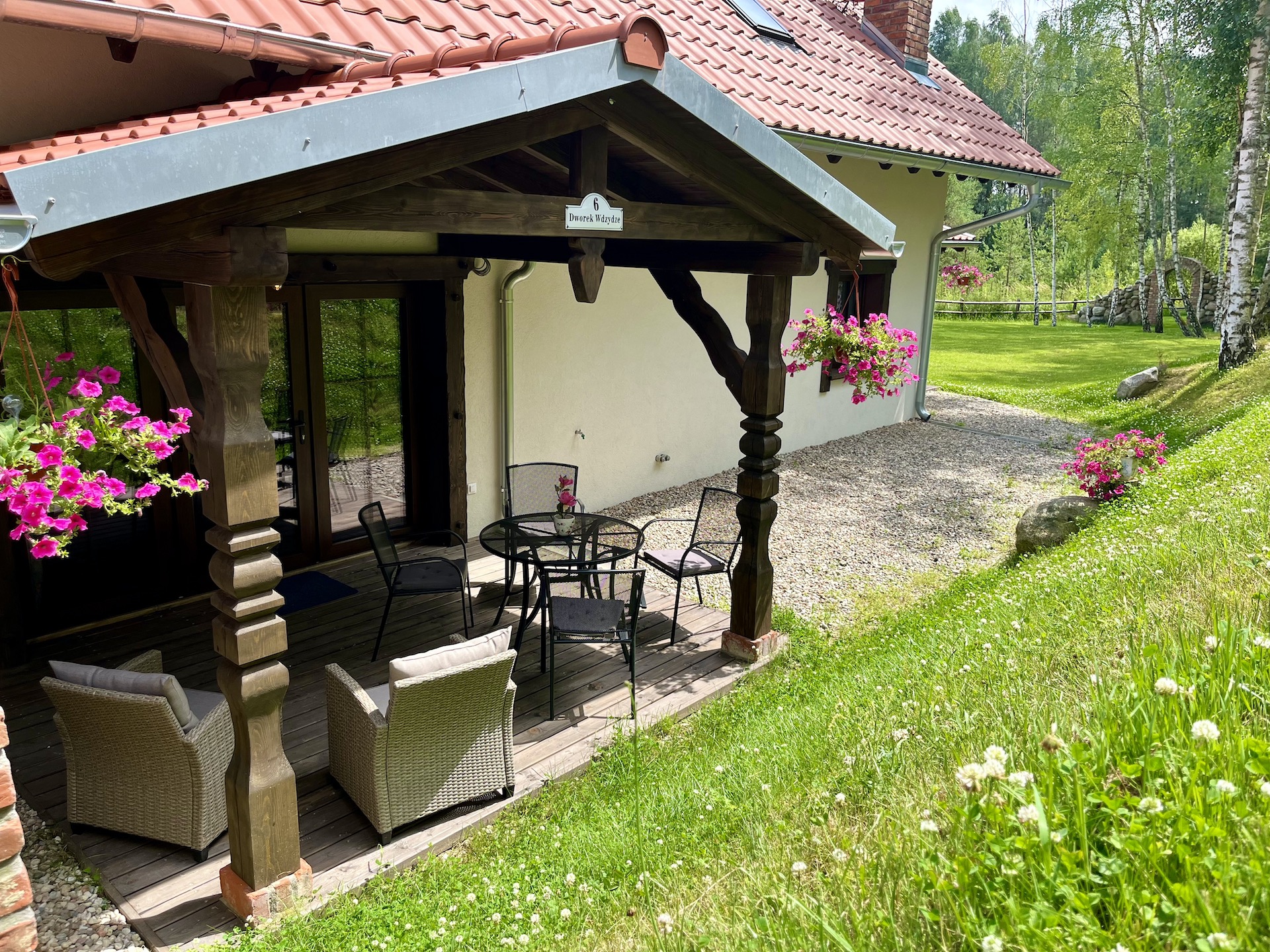 Apartament o ekspozycji południowo-zachodniej posiada niezależne wejście oraz taras, na którym znajduje się stół z krzesłami oraz dwa fotele ze stolikiem.
