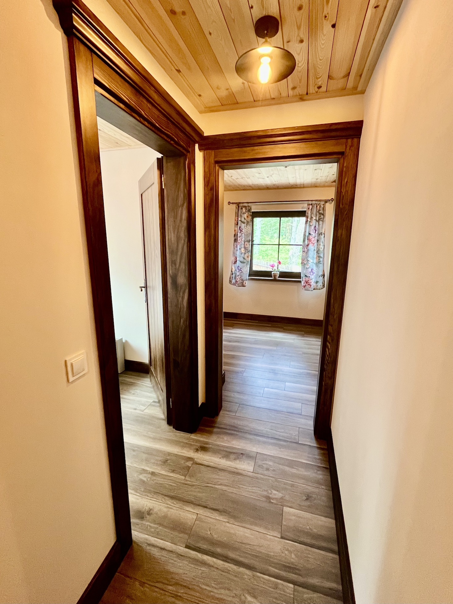 Na parterze znajduje się salon z w pełni wyposażonym aneksem kuchennym (lodówka, płyta indukcyjna, zmywarka, mikrofalówka, zlewozmywak, komplet garnków, naczyń, sztućców, itp.). Na piętrze usytuowana jest łazienka, w której mieszczą się ręczniki wraz suszarką do włosów oraz dwie sypialnie zaopatrzone w pościel. Jedna z łóżkiem podwójnym, druga z dwoma łóżkami jednoosobowymi.