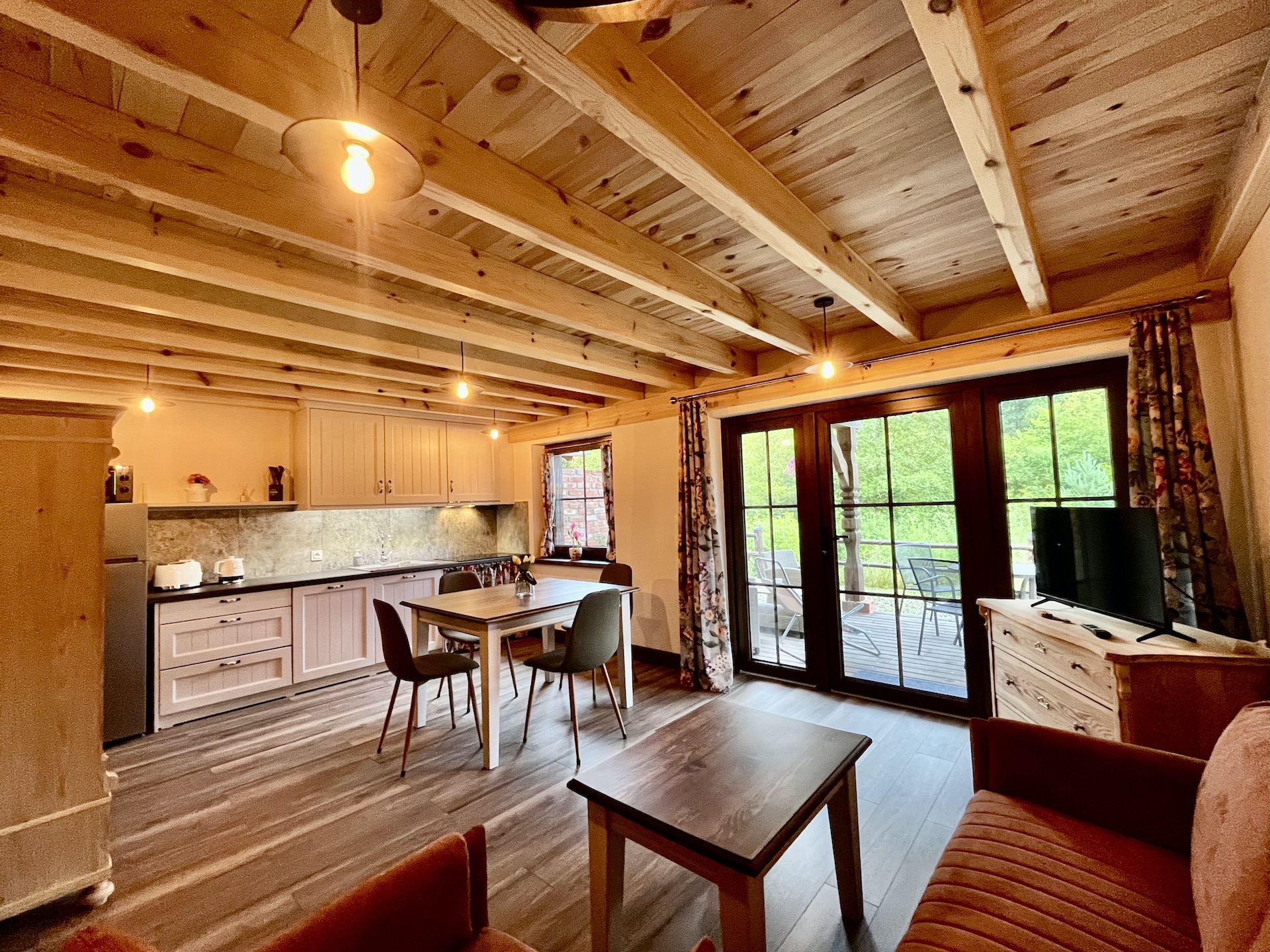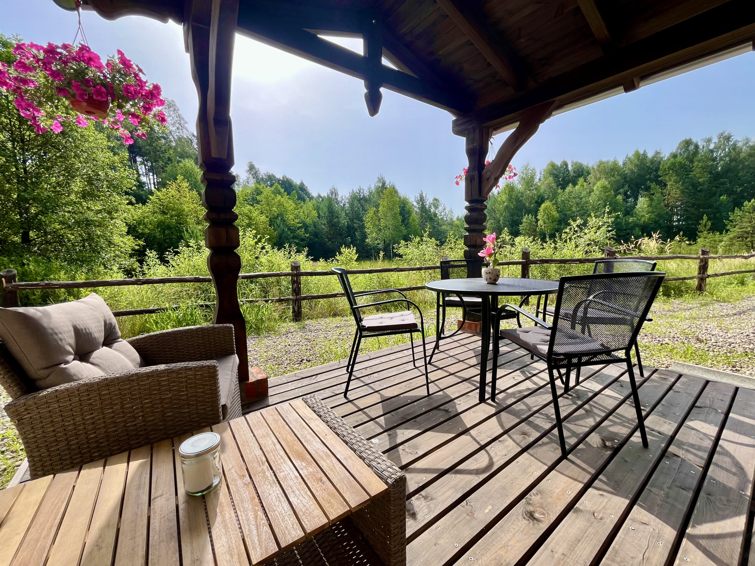 Domek o ekspozycji południowo – wschodniej posiada niezależne wejście oraz taras, na którym znajduje się stół z krzesłami oraz dwa fotele ze stolikiem.