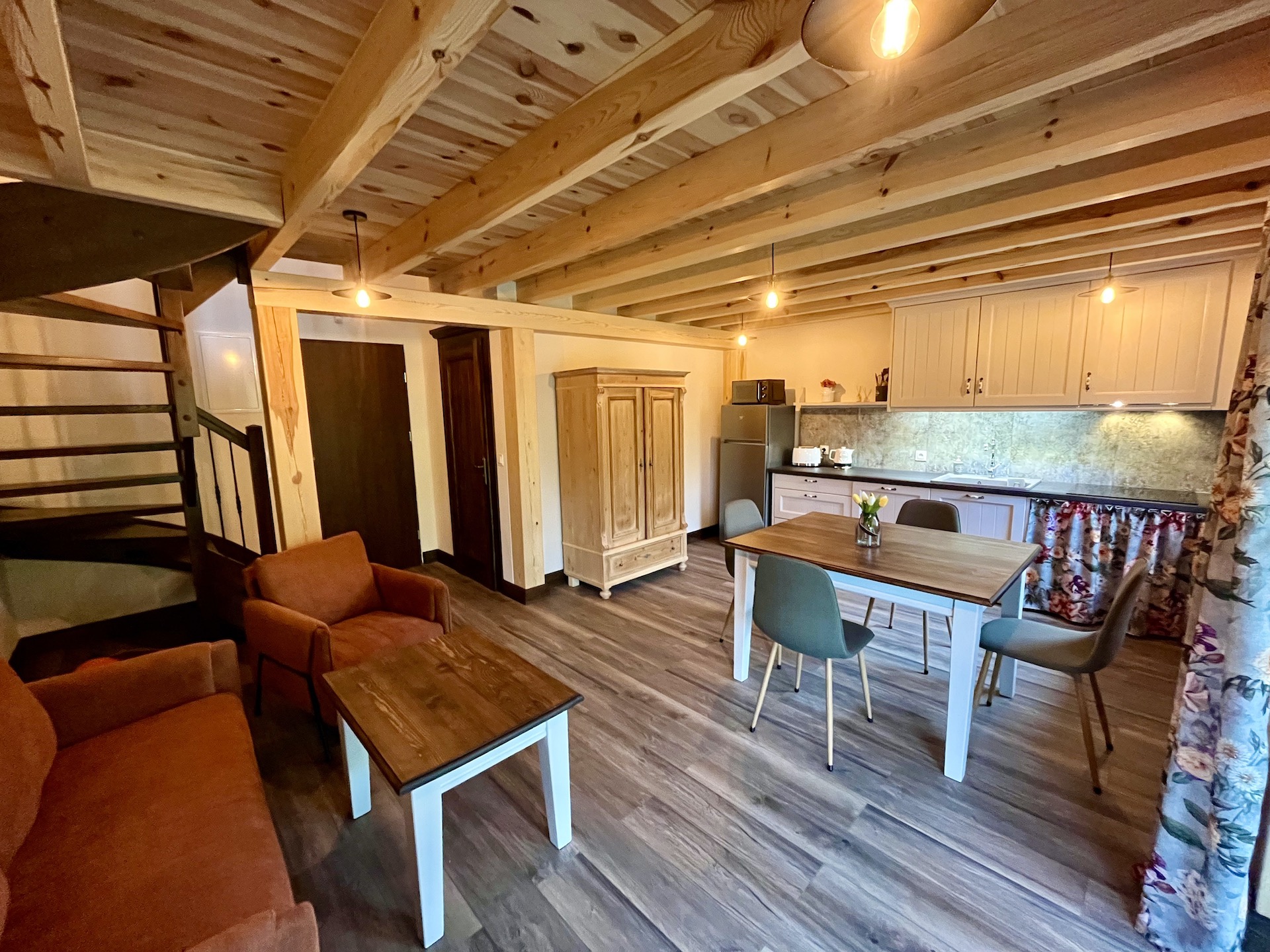 Na parterze znajduje się salon z w pełni wyposażonym aneksem kuchennym (lodówka, płyta indukcyjna, zmywarka, mikrofalówka, zlewozmywak, komplet garnków, naczyń, sztućców, itp.) oraz łazienka wyposażona w ręczniki wraz suszarką do włosów.