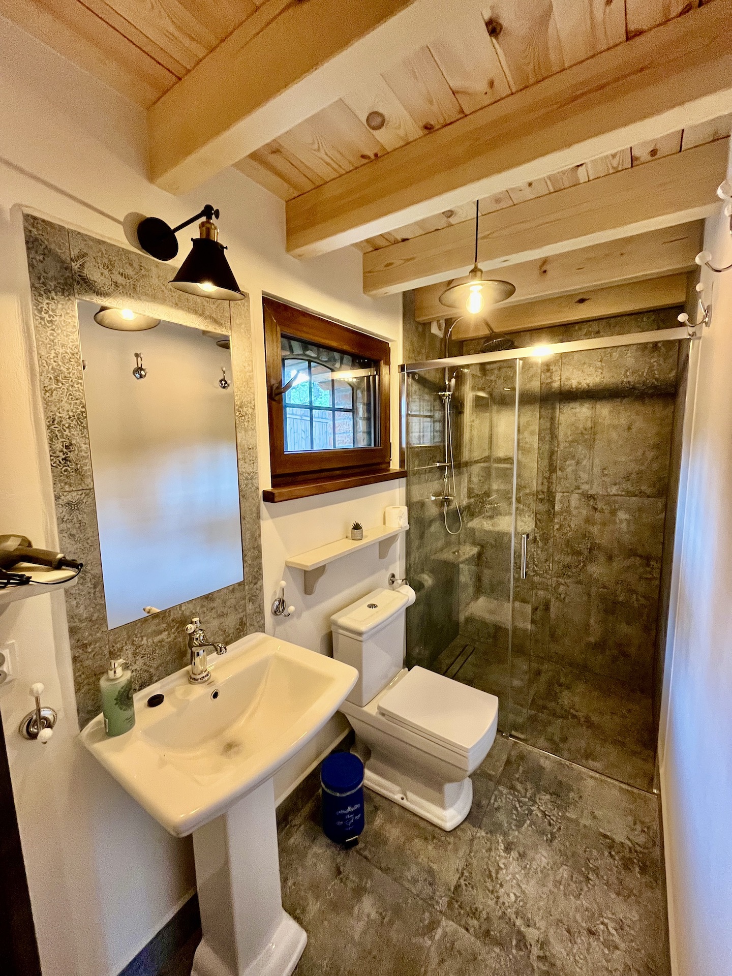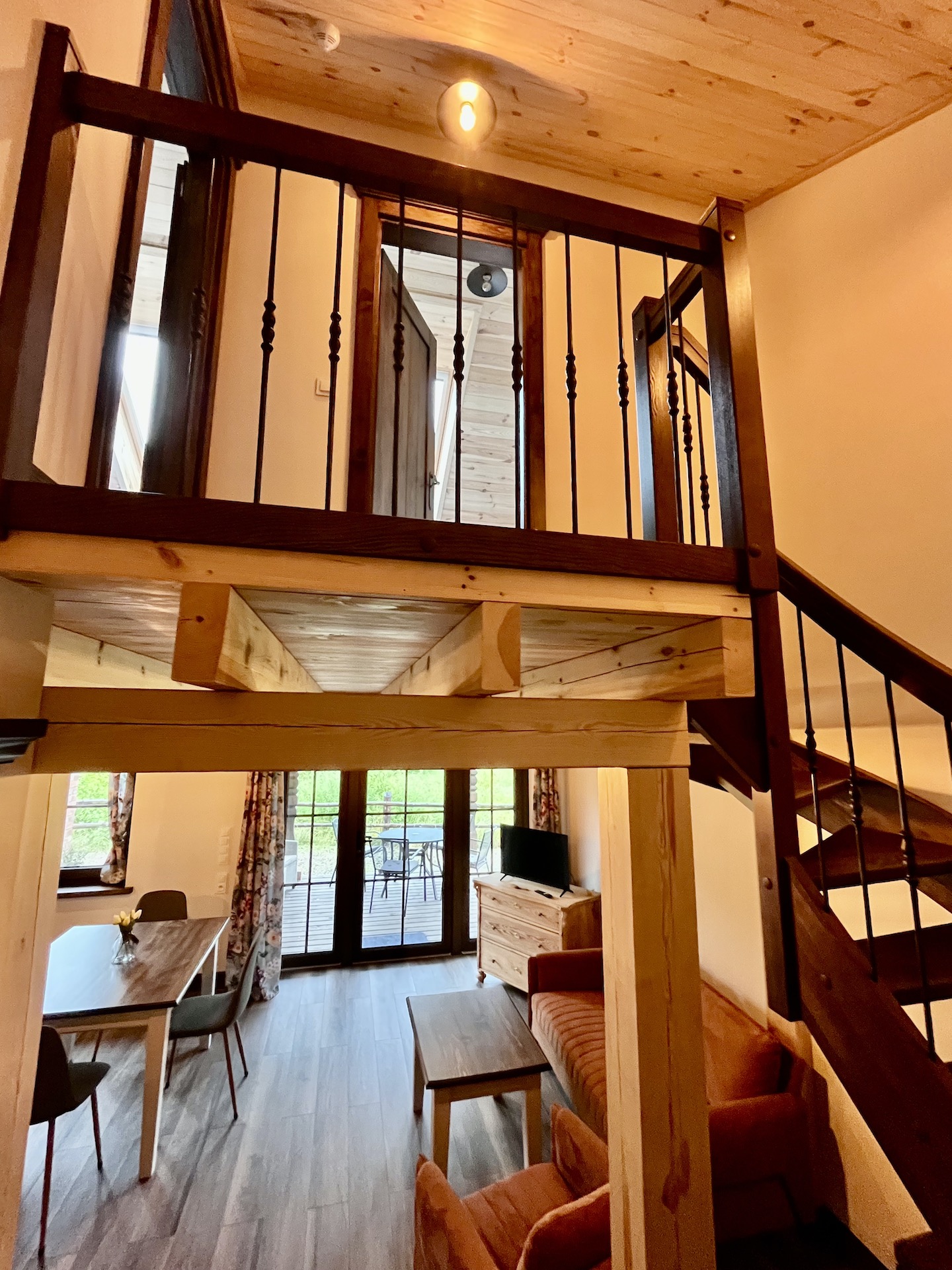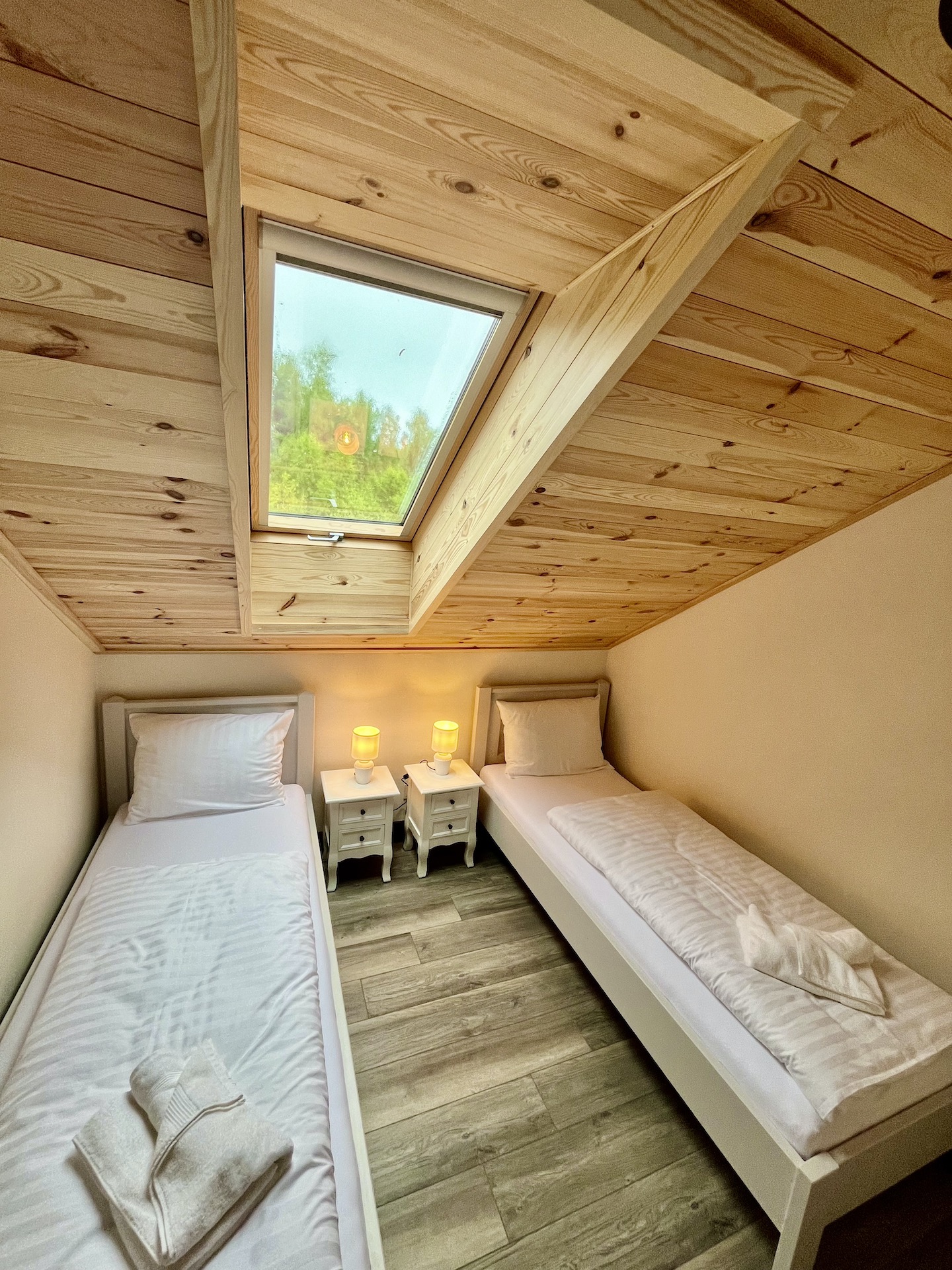 Na piętrze mieszczą się dwie sypialnie zaopatrzone w pościel. Jedna jest z łóżkiem podwójnym, druga z dwoma łóżkami jednoosobowymi.
