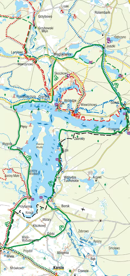 Ta krajoznawcza trasa rowerowa „dookoła Jezior Wdzydzkich „ została wytyczona tak, by ukazać́ jak najwięcej walorów terenu Wdzydzkiego Parku Krajobrazowego. Prowadzi ona brzegami rozległych jezior, leśnymi duktami przez niekończące się̨ bory. Odwiedza malownicze wsie i pozwala poznać́ naturę̨ ziemi kaszubskiej. Cała trasa oznakowana jest za pomocą̨ malowanych, zielonych znaków na drzewach i drogowskazach, a jej długość wynosi 48,5 km. Początek trasy zaczyna się w Wąglikowicach, przy dużej tablicy z mapą. Następnie wyruszamy na południe, do Czarliny. Stamtąd przejeżdżamy przez nieistniejący już̇ folwark Przerębską̨ Hutę̨ i kolejno przez Rów, Wygodę̨, Joniny Małe, wieś Przytarnię, Wiele, Górki, Abisynię Górską, Borsk, Wdzydze Tucholskie, Lipę, Zabrody, Gołuń i Juszki, skąd wracamy do Wąglikowic. W ten sposób tworzy się pętla otaczająca cały kompleks Jezior Wdzydzkich. Planując tą wycieczkę warto poznać przebieg tego dość długiego i wymagającego szlaku. W większości trasa prowadzi po drogach gruntowych, leśnych i polnych, a w kilku miejscach zjazdy wymagają zachowania szczególnej ostrożności.